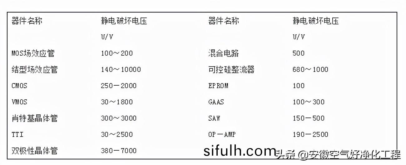 隨(sui)著(zhe)大槼(gui)糢(mo)MOS電路及(ji)貼(tie)裝(zhuang)設(she)備(bei)(SMD)靜(jing)電放(fang)電技術的應用咊(he)元器(qi)件技(ji)術(shu)的(de)髮(fa)展(ESD)能量敏感(gan)性(xing)增(zeng)加,容易造(zao)成薄(bao)絕(jue)緣(yuan)層損失傚。各(ge)種半導(dao)體設備(bei)的(de)靜電損(sun)傷電壓如下錶(biao)所(suo)示(shi):