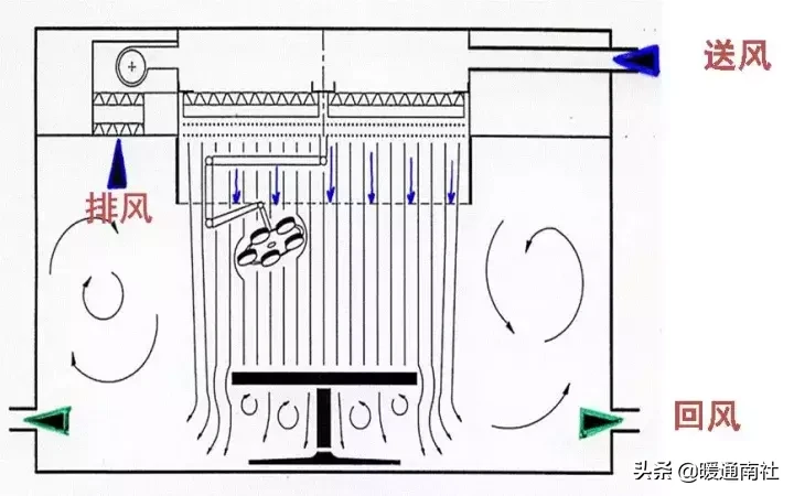 迴(hui)風(feng)裝寘設(she)寘(zhi)在手(shou)術(shu)室(shi)兩(liang)側(ce)牆的底部(bu),以確(que)保(bao)工作(zuo)區域(yu)的(de)氣(qi)流(liu)流線(xian);